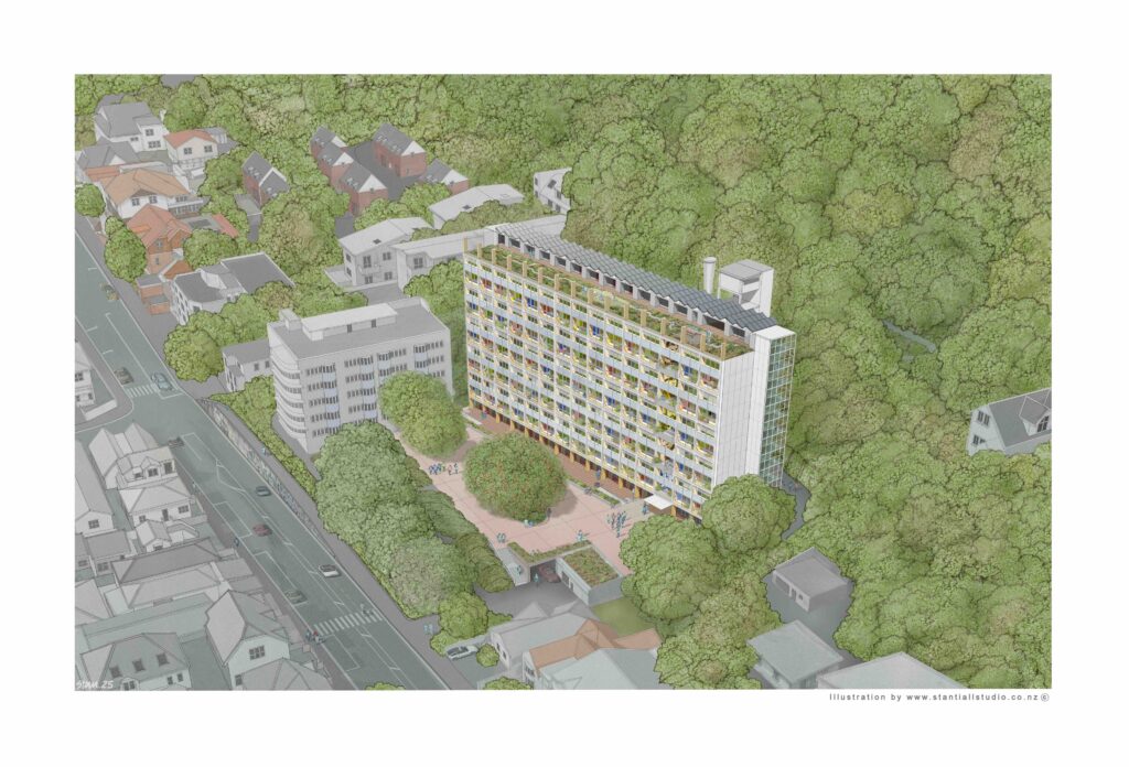 Faster, greener, more affordable housing Victoria University – Te Herenga Waka (VUW) is urged to reuse the structure ofWellington’s controversial Gordon Wilson Flats (GWF) to deliver modern housing and save carbon, time, waste-to-landfill and impact on the city. The Architectural Centre has put forward an alternative plan to VUW that would replace the building’s façade…