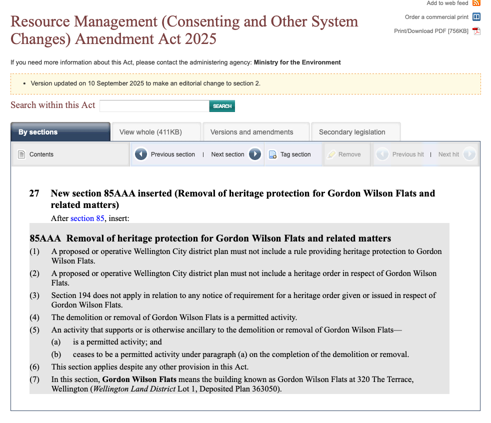 In accordance with the Resource Management (Consenting and Other System Changes) Amendment Act 2025, NZ Legislation website, the Council removed heritage protection for Gordon Wilson Flats, 320 The Terrace, Te Aro.